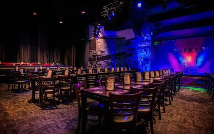 The venue has a modern, casual vibe with a cozy, intimate seating arrangement that allows for excellent sightlines and a personal connection to the performers. The stage is well-lit, and the room is designed to create a lively, energetic environment where laughter fills the space. Guests can enjoy full food and drink service, making it ideal for a night out with dinner and a show.