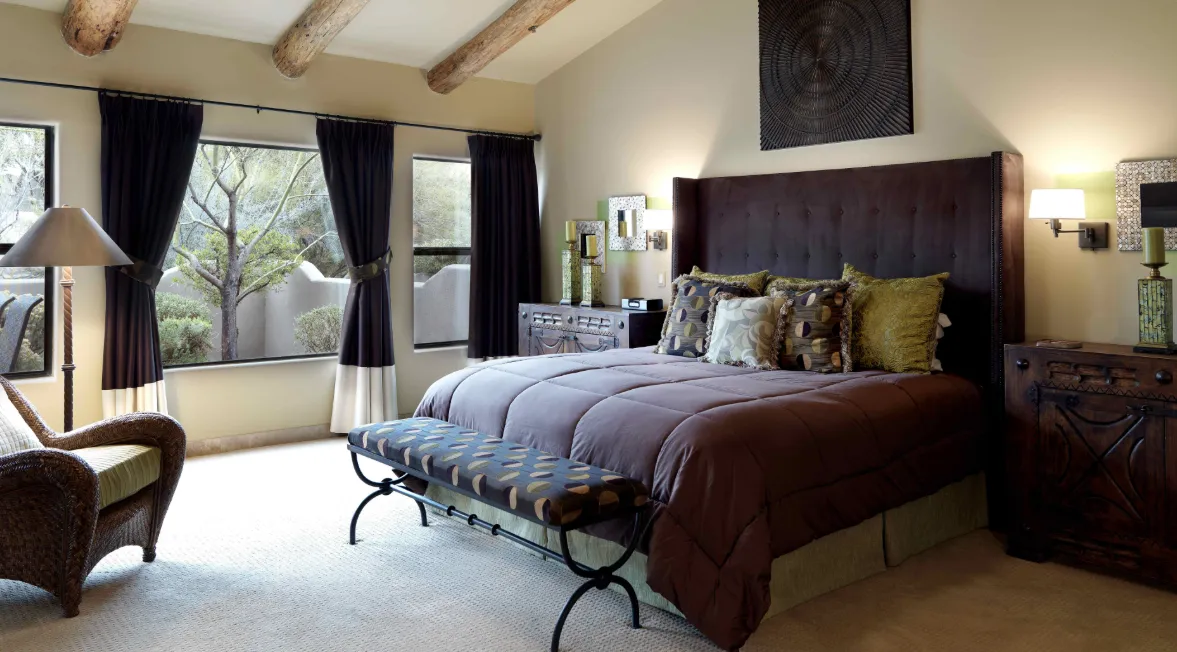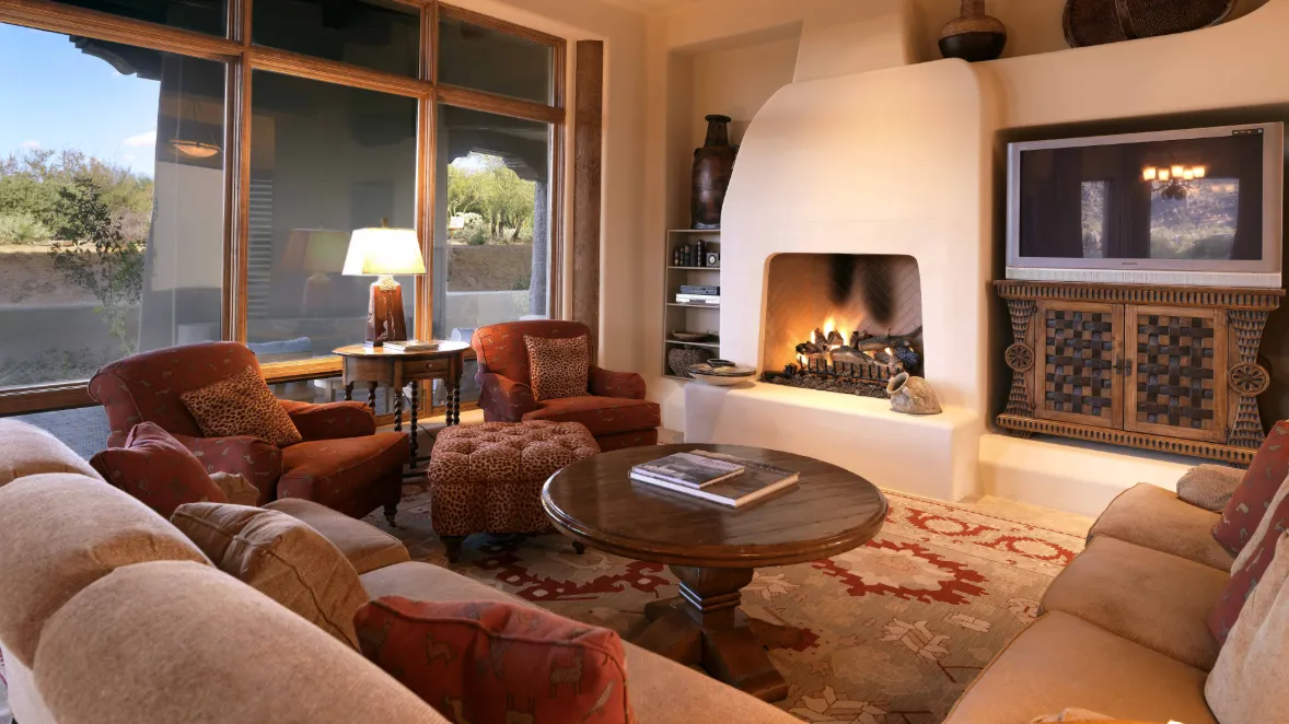 The Boulders Resort & Spa in Scottsdale, Arizona, offers a distinctive atmosphere and design that harmoniously integrates with the rugged beauty of the Sonoran Desert. The resort's architecture features adobe-style buildings with rounded contours, avoiding straight lines to mimic the natural forms of the surrounding desert landscape. These low-rise structures are thoughtfully arranged in clusters, connected by meandering golf cart paths, ensuring minimal visual impact on the environment.
