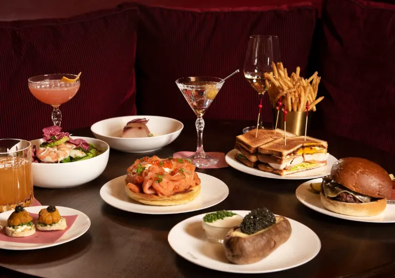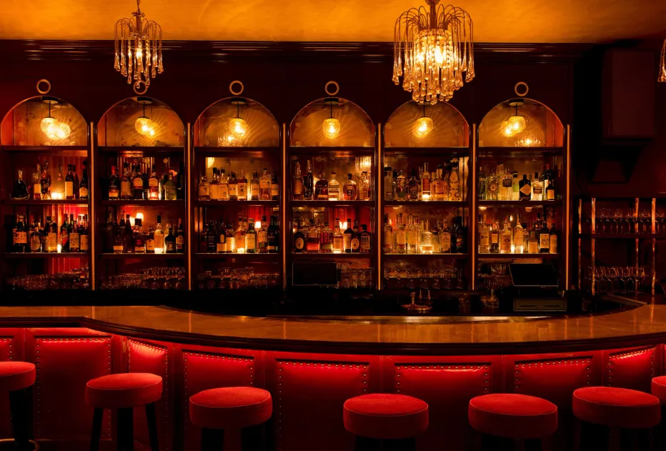 The Nines offers an atmosphere steeped in old-world glamour, drawing inspiration from iconic European hotel bars like Bar Hemingway at the Ritz Paris and Dukes Bar in London. Upon entering through a discreet vestibule, guests are greeted by a crimson-hued interior featuring plush velvet banquettes, gold-framed mirrors, and Murano glass chandeliers.