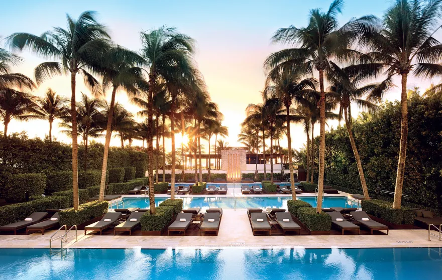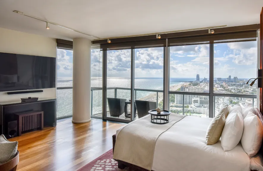 The Setai Miami Beach is a luxurious hotel that seamlessly blends the elegance of Art Deco architecture with serene Asian-inspired design. Located at 2001 Collins Avenue in the heart of South Beach, this five-star property offers an oasis of tranquility amidst the vibrant energy of Miami Beach. The hotel features 90 rooms and 50 suites, each thoughtfully appointed with teak wood floors, black granite bathrooms, and custom-designed furnishings, creating a serene and sophisticated atmosphere. Guests can enjoy three temperature-controlled infinity pools, beachfront service, and exceptional dining experiences led by Executive Chef Vijay Veena. The Setai also boasts a Spa by THÉMAÉ and a Les Clefs d’Or chief concierge, ensuring personalized service and unparalleled comfort.
