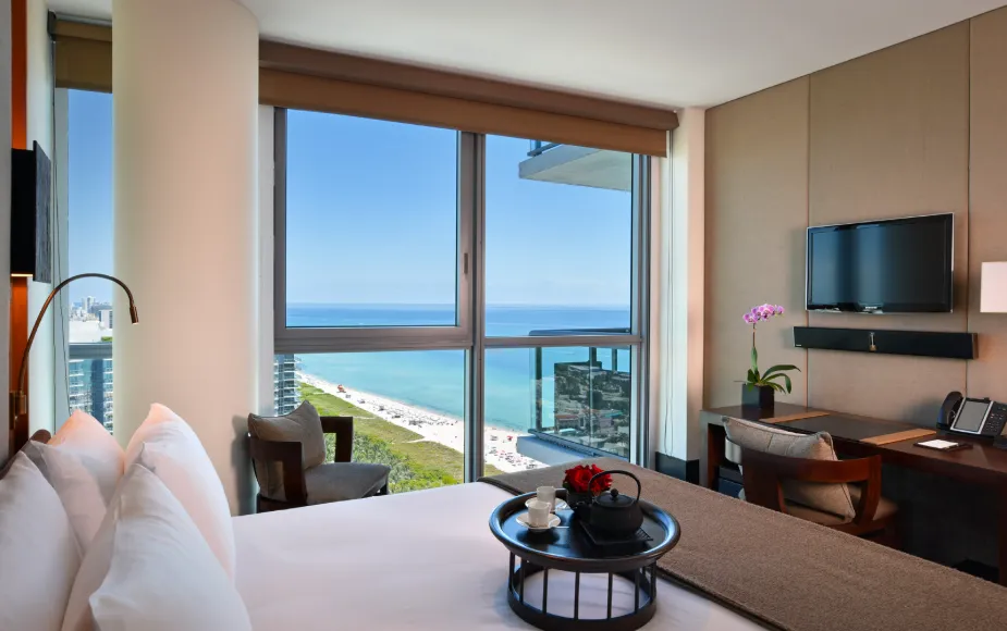 The Setai Miami Beach offers a refined blend of Art Deco elegance and Asian-inspired tranquility. Designed by renowned Indonesian architect Jaya Ibrahim, the hotel features interiors that harmoniously combine the sleek lines of 1930s Shanghai with the serene aesthetics of Bali. The lobby welcomes guests with antique gray brick flooring imported from Shanghai and a tranquil water feature, setting a serene tone upon arrival.