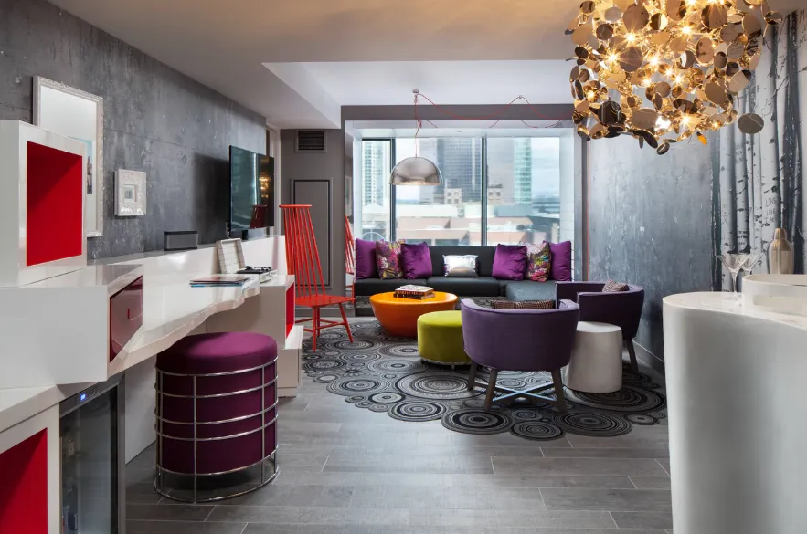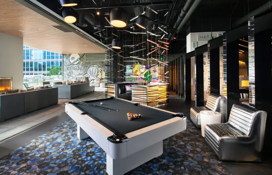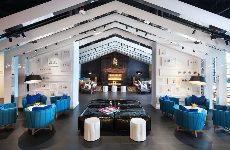 W Bellevue offers a dynamic and imaginative atmosphere, blending the charm of a lakeside retreat with contemporary urban flair. Drawing inspiration from the region's agrarian roots and lakeside culture, the hotel's design evokes the essence of a modern lake house, reimagined with bold patterns, vivid colors, and eclectic furnishings.