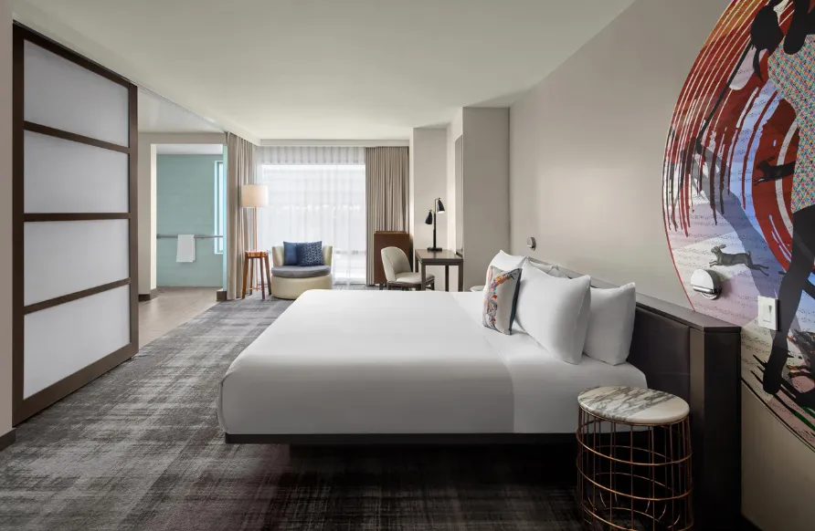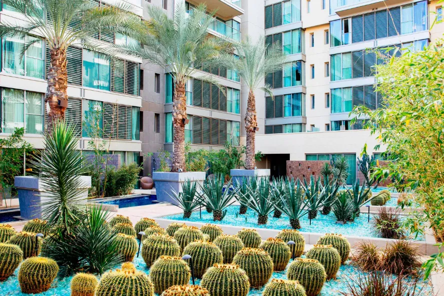 The W Scottsdale Hotel features a sleek, modern design that blends desert-inspired elements with high-energy, urban style. Its all-glass exterior, moveable shutters, and striking water features create a bold architectural presence, while interiors showcase natural stone, reflective glass, and warm desert tones. The atmosphere is both luxurious and social, with spaces like the open-concept Living Room lounge, stylish bars, a Zen Garden, and poolside cabanas designed for relaxation, connection, and a lively nightlife scene.