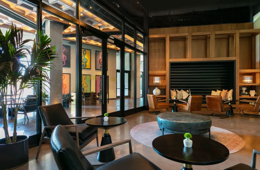 W Nashville offers a vibrant and immersive atmosphere that harmoniously blends Nashville's rich cultural heritage with contemporary design elements. Located in the trendy Gulch neighborhood, the hotel features a 14-story mirrored glass tower, serving as a modern beacon in the city's skyline. Inside, the design concept, crafted by Rockwell Group, draws inspiration from Nashville's historical, social, and physical juxtapositions, reflecting the city's transformation from agrarian roots to a center of creative innovation. The interiors showcase a "clean maximalism" approach, incorporating noble materials and a diverse range of artwork to create spaces that are both grand and intimate. Signature spaces like the "Welcome Den," "Living Room," and "Sound Room" offer unique environments for relaxation and socialization, each with its own distinct character and ambiance. The hotel's design not only pays homage to Nashville's past but also sets the stage for a dynamic and engaging guest experience.