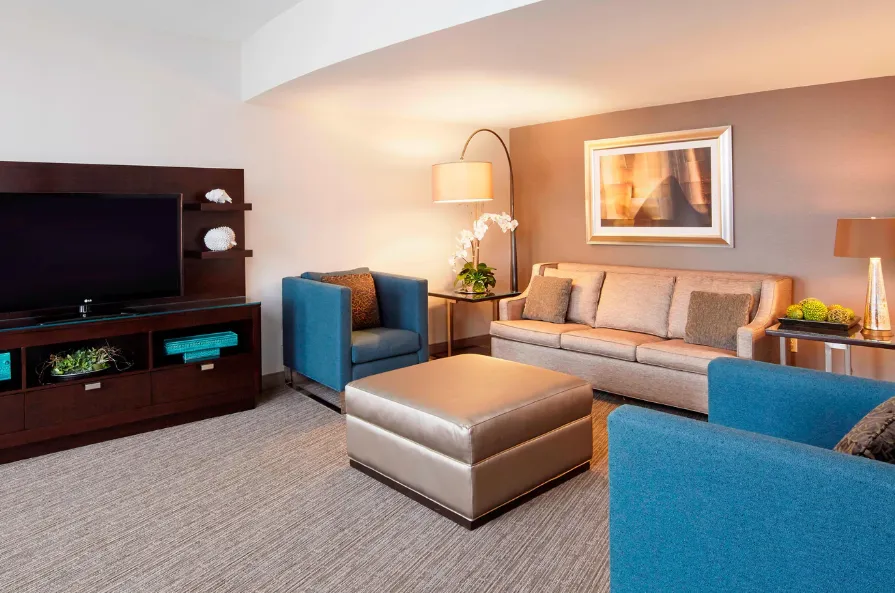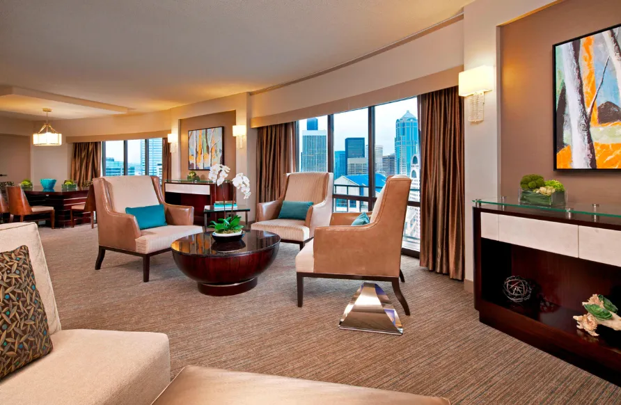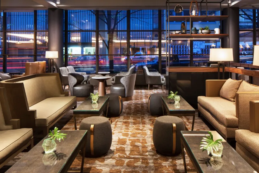 The Westin Seattle offers a sophisticated and serene atmosphere, seamlessly blending modern design with elements that reflect the city's vibrant character. he interior design, led by Kay Lang + Associates, encompasses 900 guestrooms and suites, public areas, corridors, meeting spaces, and the Relish Burger Bistro, covering a total area of 592,000 square feet across both towers.
