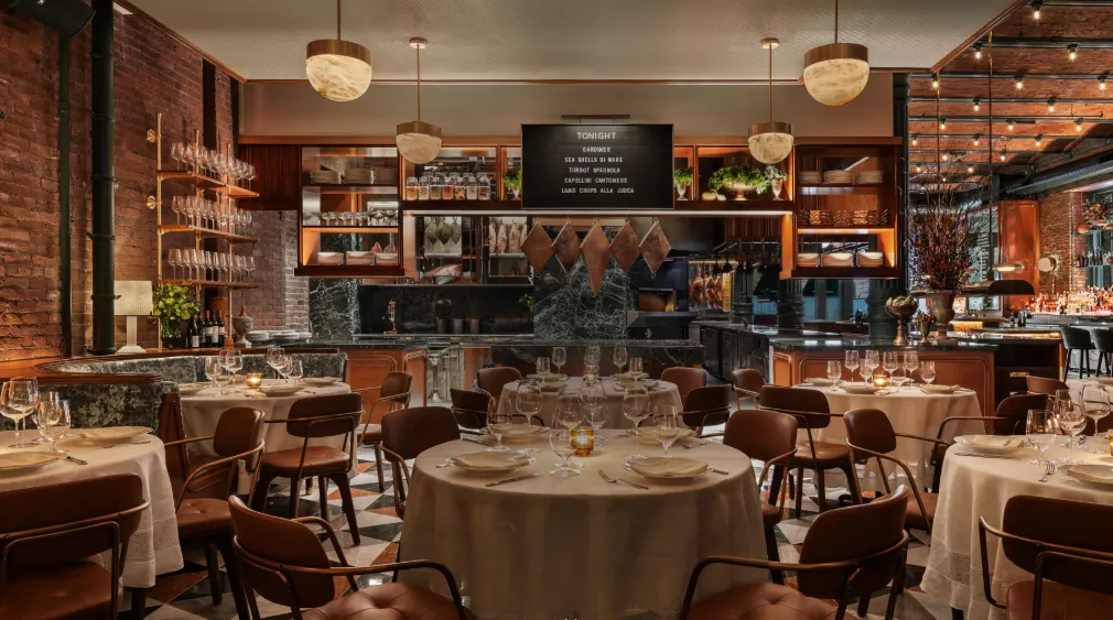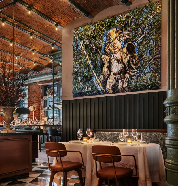 Torrisi Bar & Restaurant, nestled within the historic Puck Building in Nolita, offers a dining experience that artfully blends industrial elegance with timeless sophistication. Designed by Garrett Singer Architecture + Design, the space honors the 19th-century architecture through exposed red-brick walls, vaulted ceilings, and monumental cast-iron columns, creating a lofty and vibrant atmosphere. The open kitchen adds a dynamic element, allowing guests to witness the culinary artistry firsthand. Lighting plays a pivotal role in setting the mood; alabaster and brass sconces emit a warm glow, while emerald green marble floors and mercury-stained mirrors introduce a touch of opulence. The front bar area, featuring a long counter and high-top seating, offers a more casual setting, while the back dining room provides an intimate fine-dining experience with only fourteen tables, ensuring exclusivity and comfort. Overall, Torrisi's design creates a space that is both grand and inviting, reflecting the rich history of its location while offering a contemporary and luxurious dining environment.