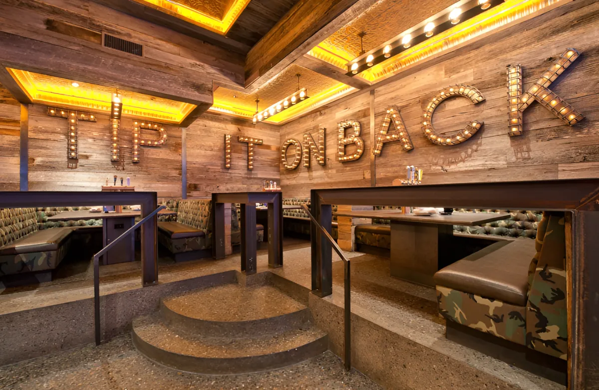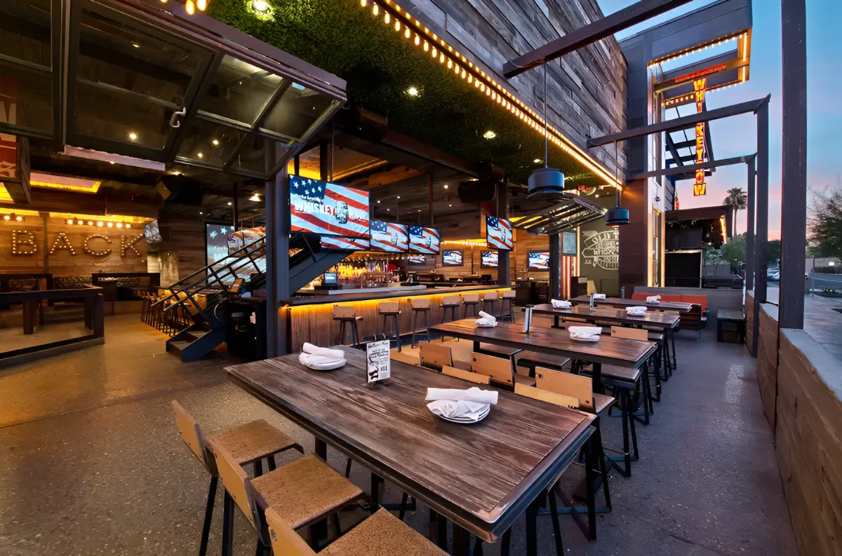 Inspired by Dierks Bentley's country roots, Whiskey Row pays homage to Arizona’s former “Whiskey Row” in Prescott with rustic charm and modern sophistication. Expect reclaimed wood finishes, vintage accents like an old Farmall tractor and wide American flag murals, contrasted with iPad-controlled visual/audio tech and tabletop pour-taps for drink. The two-level venue includes a 360° suspended stage above the bar and a centrally placed LED wall, creating an immersive setting for nightlife and live music.