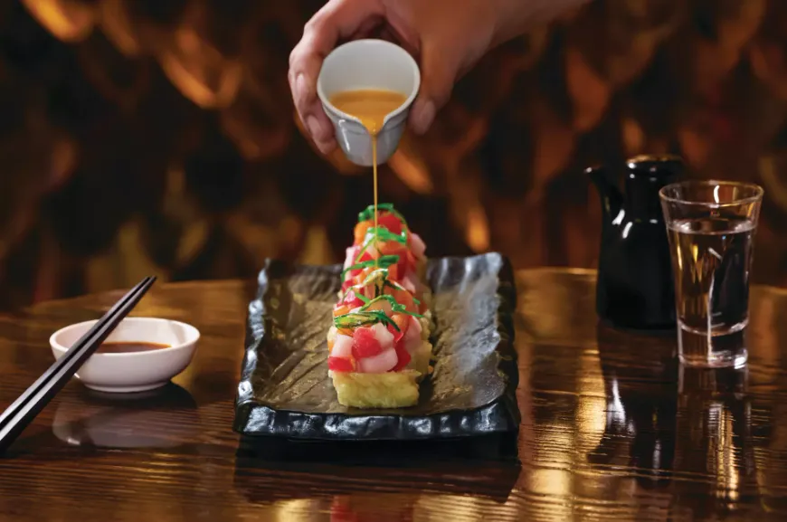 Yellowtail Japanese Restaurant & Lounge, located within the Bellagio Hotel & Casino in Las Vegas, offers a sophisticated dining experience that blends traditional Japanese cuisine with contemporary flair. Helmed by Chef Akira Back, the restaurant showcases innovative dishes crafted from the freshest seasonal ingredients, including raw seafood and 48-hour braised Wagyu beef. Signature items such as the Bigeye Tuna Pizza and Maine Lobster Carpaccio exemplify the restaurant's creative approach to Japanese dining.