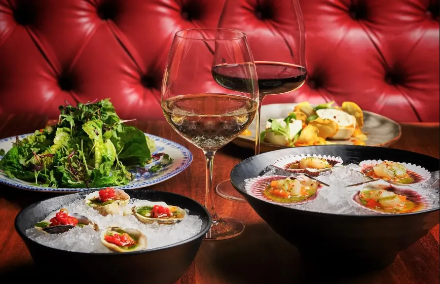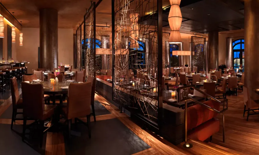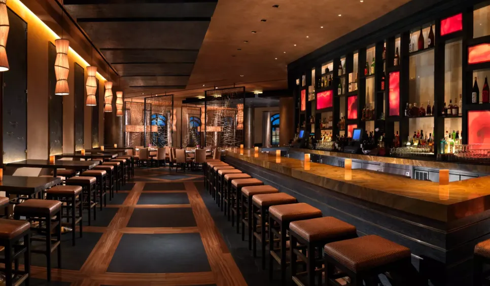The restaurant's expansive space features elegant wood and stone décor, creating a vibrant yet intimate atmosphere. A striking 25-by-13-foot bronze wall-mounted installation of the dorsal side of a yellowtail fish greets guests at the entrance, setting the tone for the dining experience. The design, crafted by the world-renowned Rockwell Group of New York City, fosters a warm and sensual ambiance.